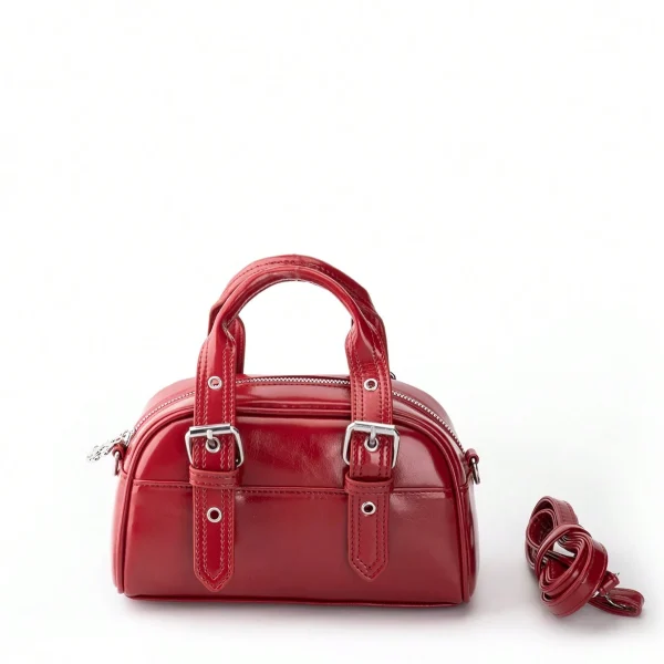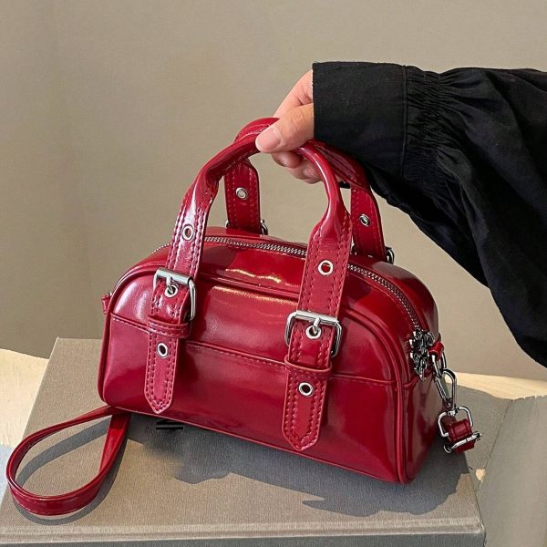 حقيبة بولينج نسائية نبيذي، جلد صناعي بتفاصيل بانك وحلقات معدنية، ستايل كاجوال عصري للاستخدام اليومي