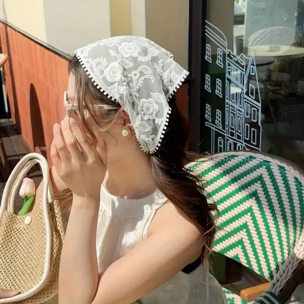 شريطة رأس مثلث بيضاء نسائية بنقشة زهرية، تصميم فرنسي أنثوي للعطلات والإطلالات اليومية