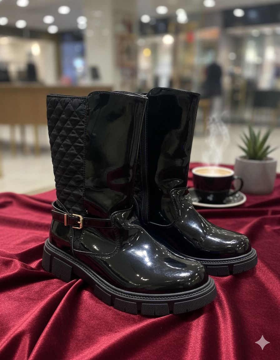 يتميز هذا البوت النسائي الأنيق بتصميم عصري يجمع بين الفخامة والراحة، مصنوع من الجلد الصناعي اللامع بلون أسود كلاسيكي يضفي لمسة راقية على الإطلالة.