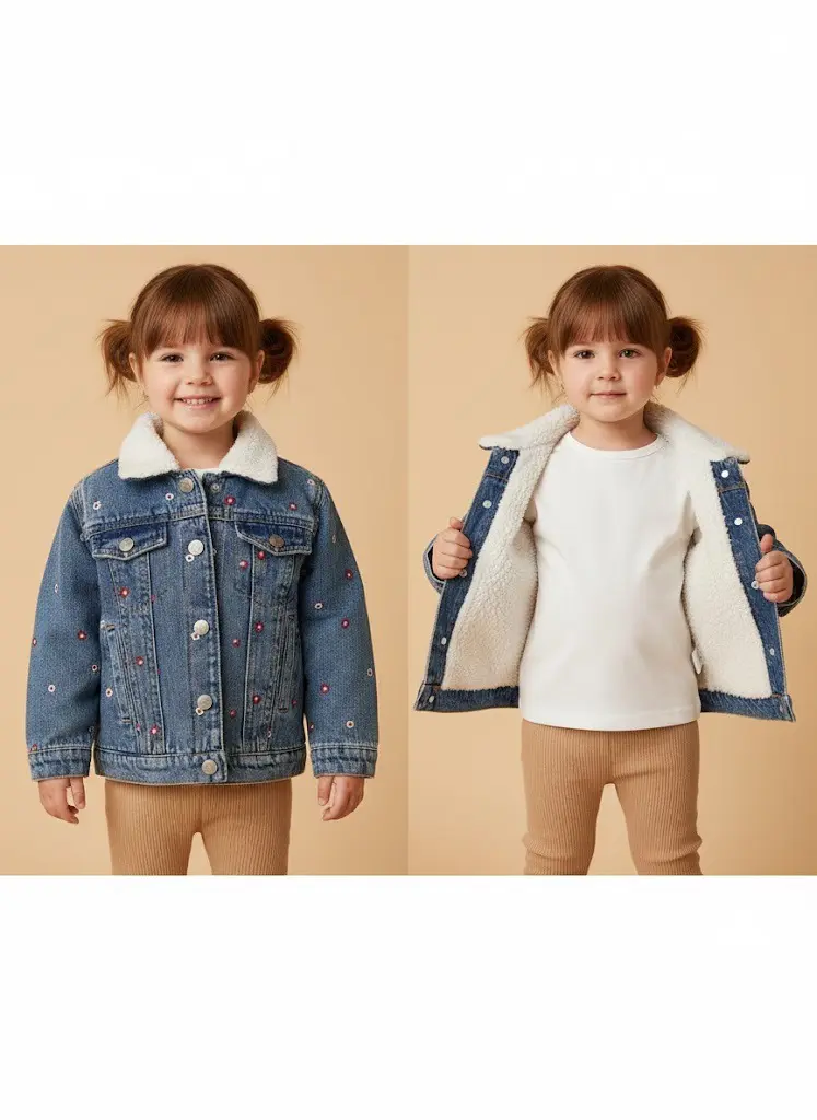 جاكيت جينز يجمع بين الأناقة والتدفئة القصوى؛ يتميز بتطريز زهور رقيقة وبطانة فرو “شيربا” بيضاء ناعمة. قطعة أساسية في خزانة طفلتك تمنحها إطلالة عصرية ودافئة في الشتاء.