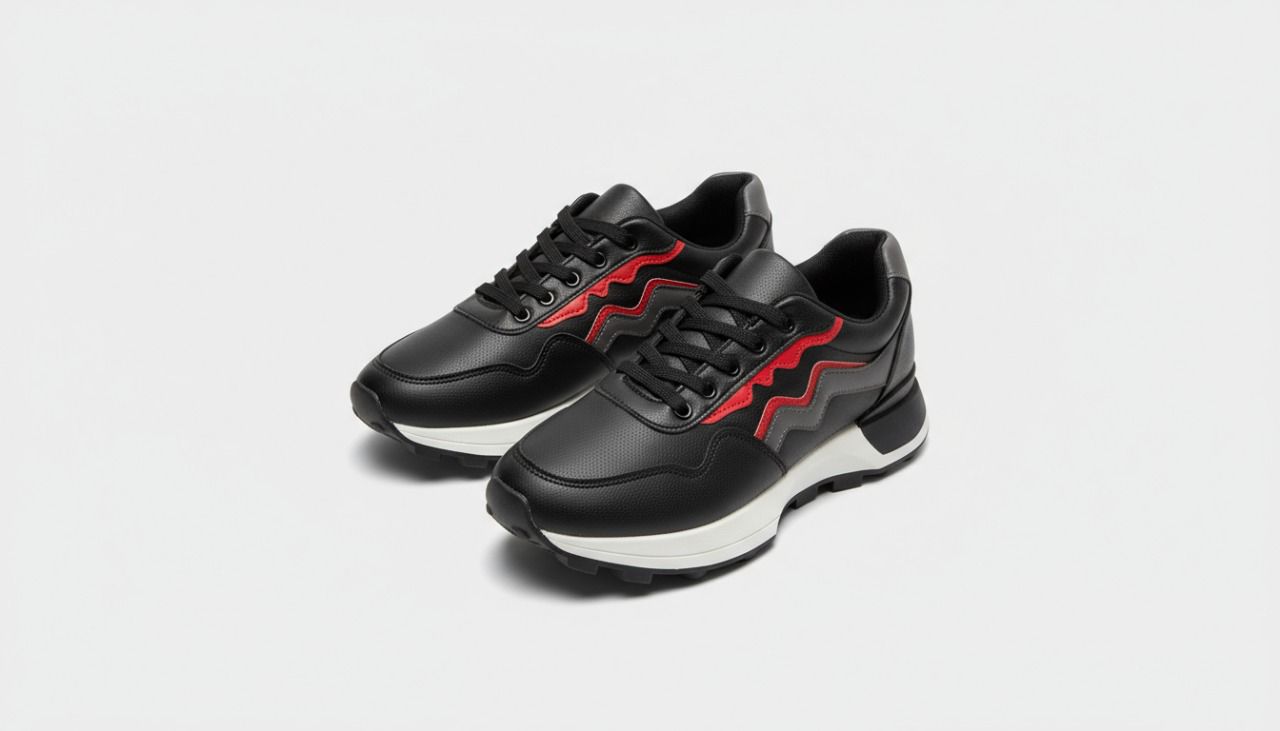 يتميز بلونه الأسود الأنيق مع تفاصيل حمراء تمنح مظهرًا نابضًا بالحيوية، إلى جانب نعل أبيض سميك يوفر دعمًا مريحًا أثناء المشي اليومي أو الأنشطة الخفيفة.