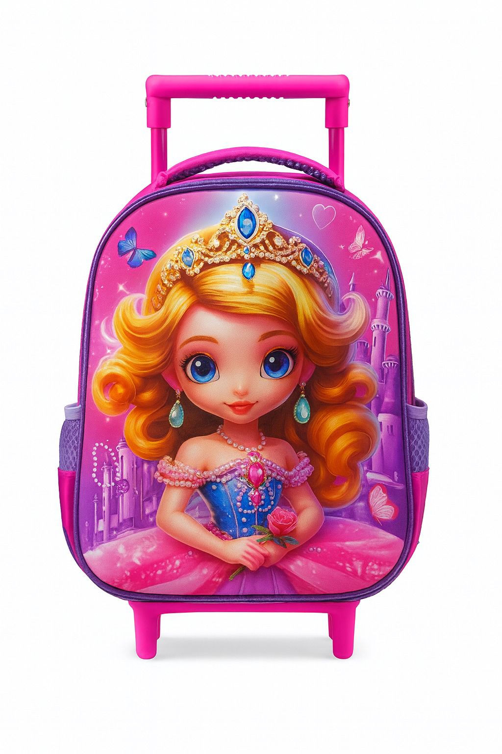 شنطة مدرسية بعجلات للبنات بتصميم أميرة كرتونية، ألوان وردي وبنفسجي زاهية، يد سحب متينة، وصورة أميرة بتاج ملكي، مثالية للمدرسة والسفر