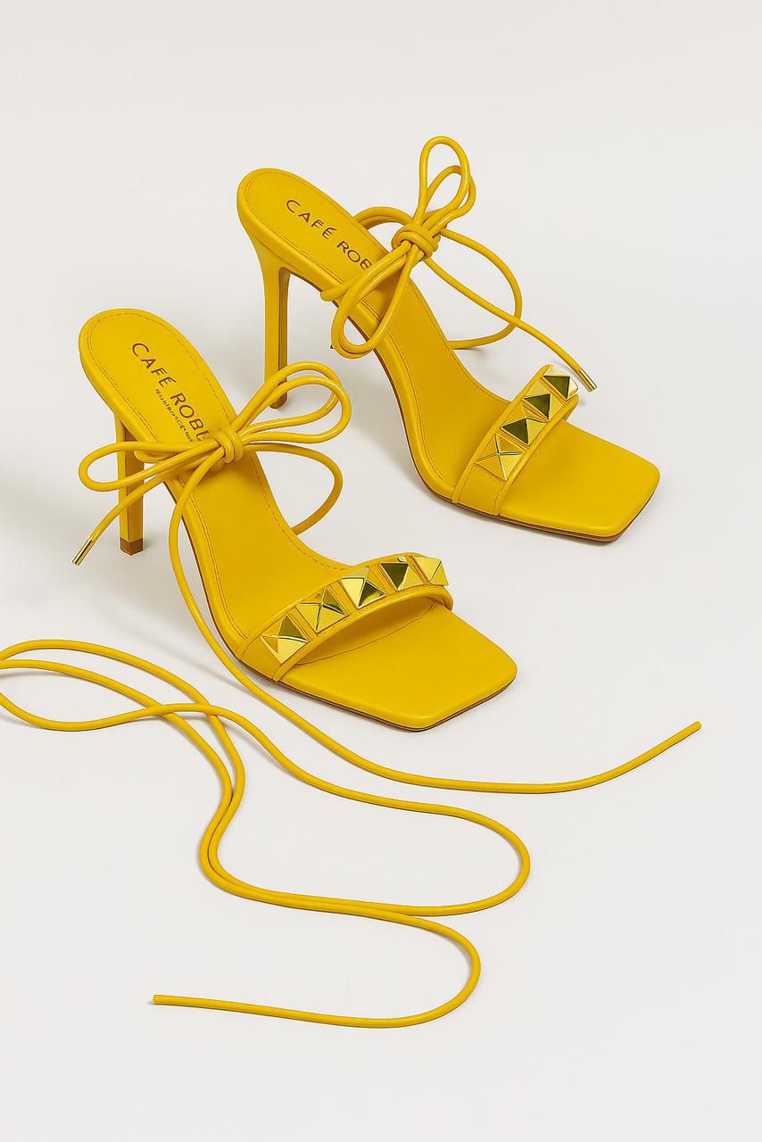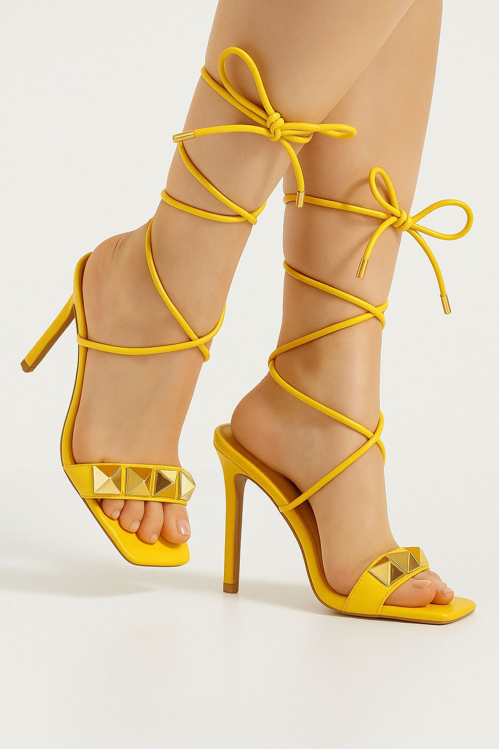 صندل نسائي أصفر بكعب عالي، رباط كاحل ومسامير ذهبية من Cape Robbin، تصميم متوازن يجمع بين العملية والجاذبية البصرية