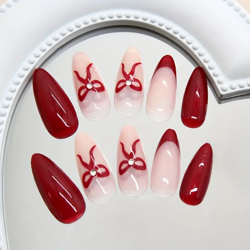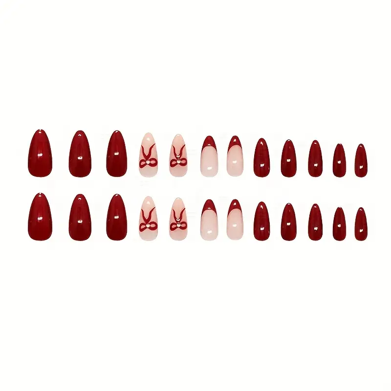 أظافر نسائية شكل لوز عين القط الأحمر والبورغندي، مجموعة 24 قطعة لفن الأظافر الاحتفالي