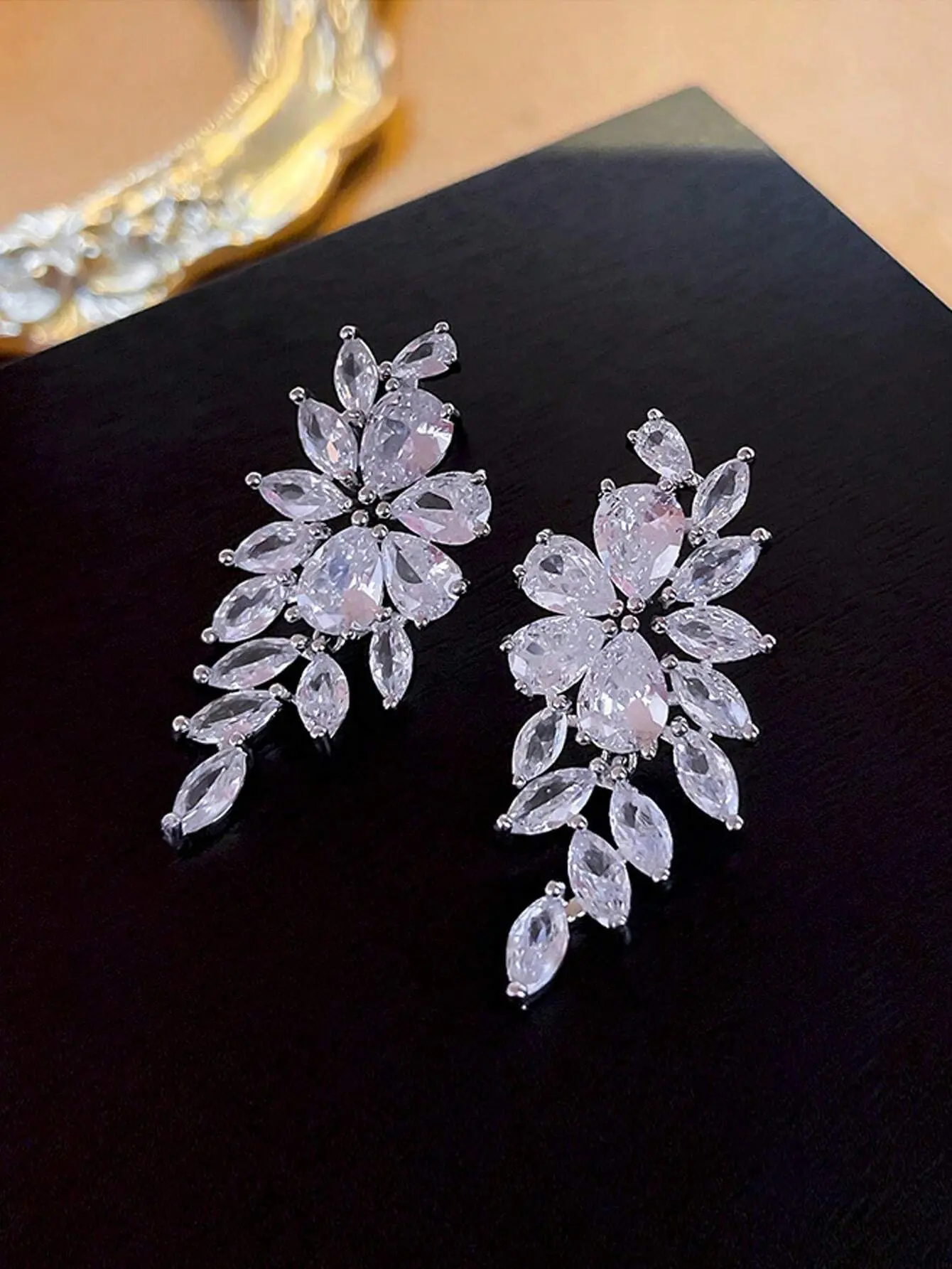 استمتعي بإطلالة راقية لا مثيل لها مع أقراط الزفاف الفاخرة المصممة بأسلوب أوروبي وأمريكي أنيق. تأتيكِ هذه الأقراط بتصميم أوراق متدلّية تشبه زهور الوِستريا، لتُضفي لمسة من الفخامة والأنوثة الراقية على كل لحظة خاصة في حياتكِ، من حفلات الخطوبة إلى ليلة الزفاف.
