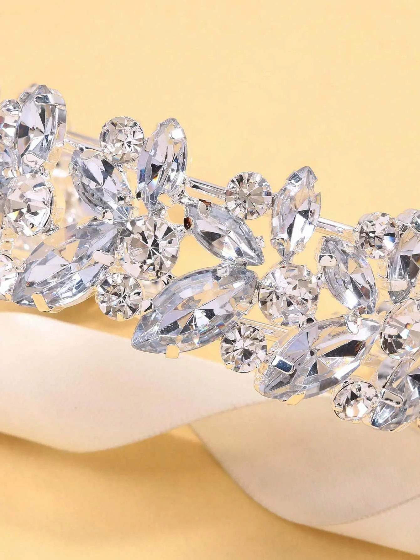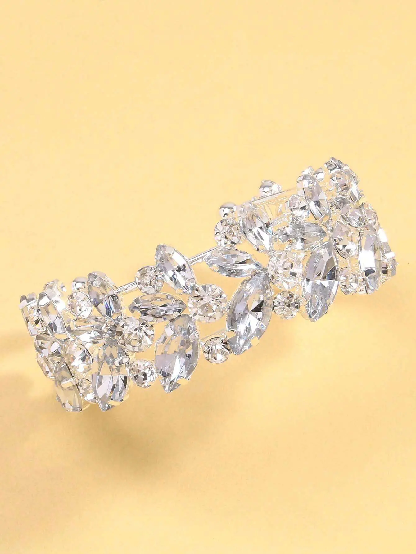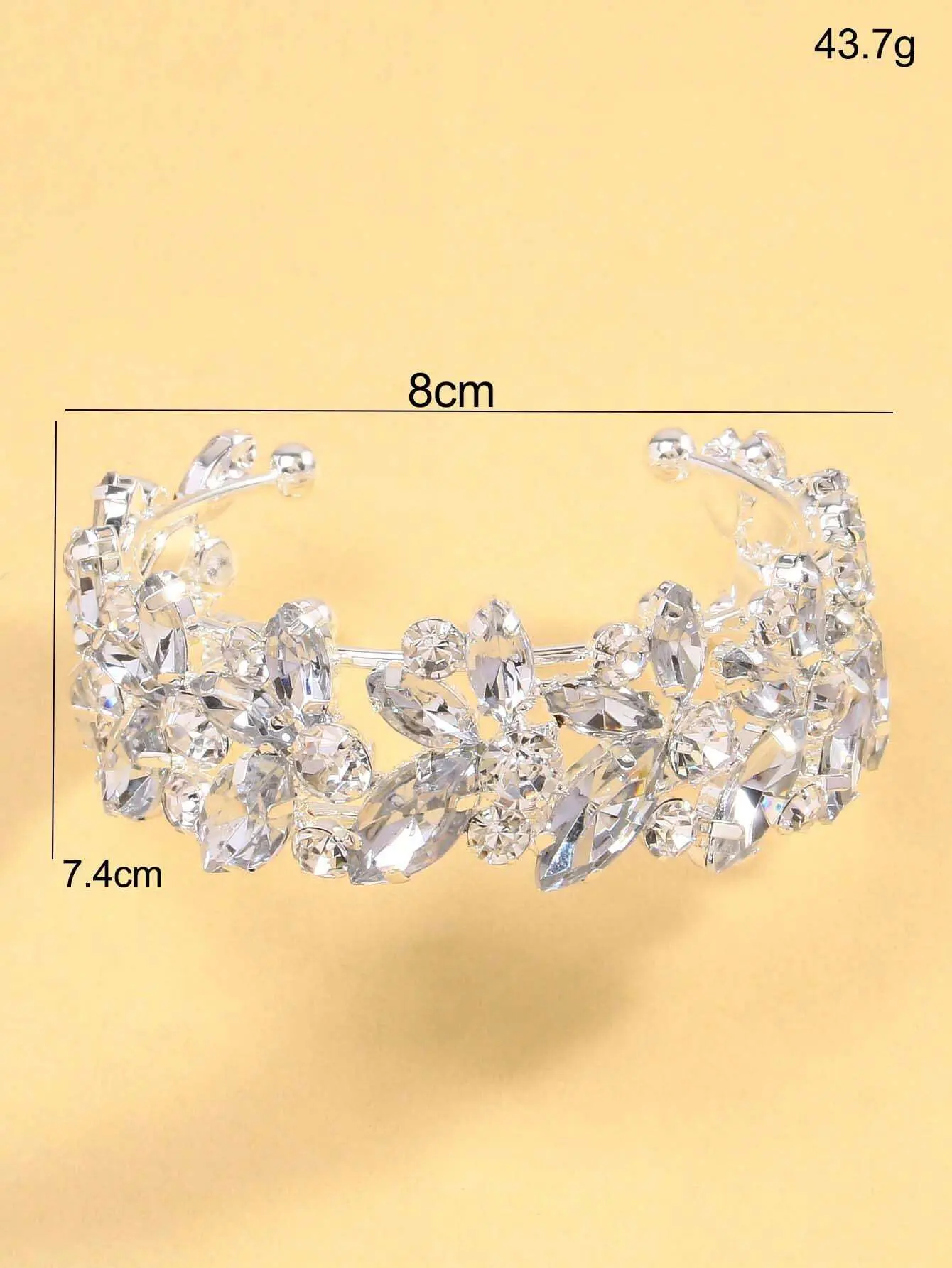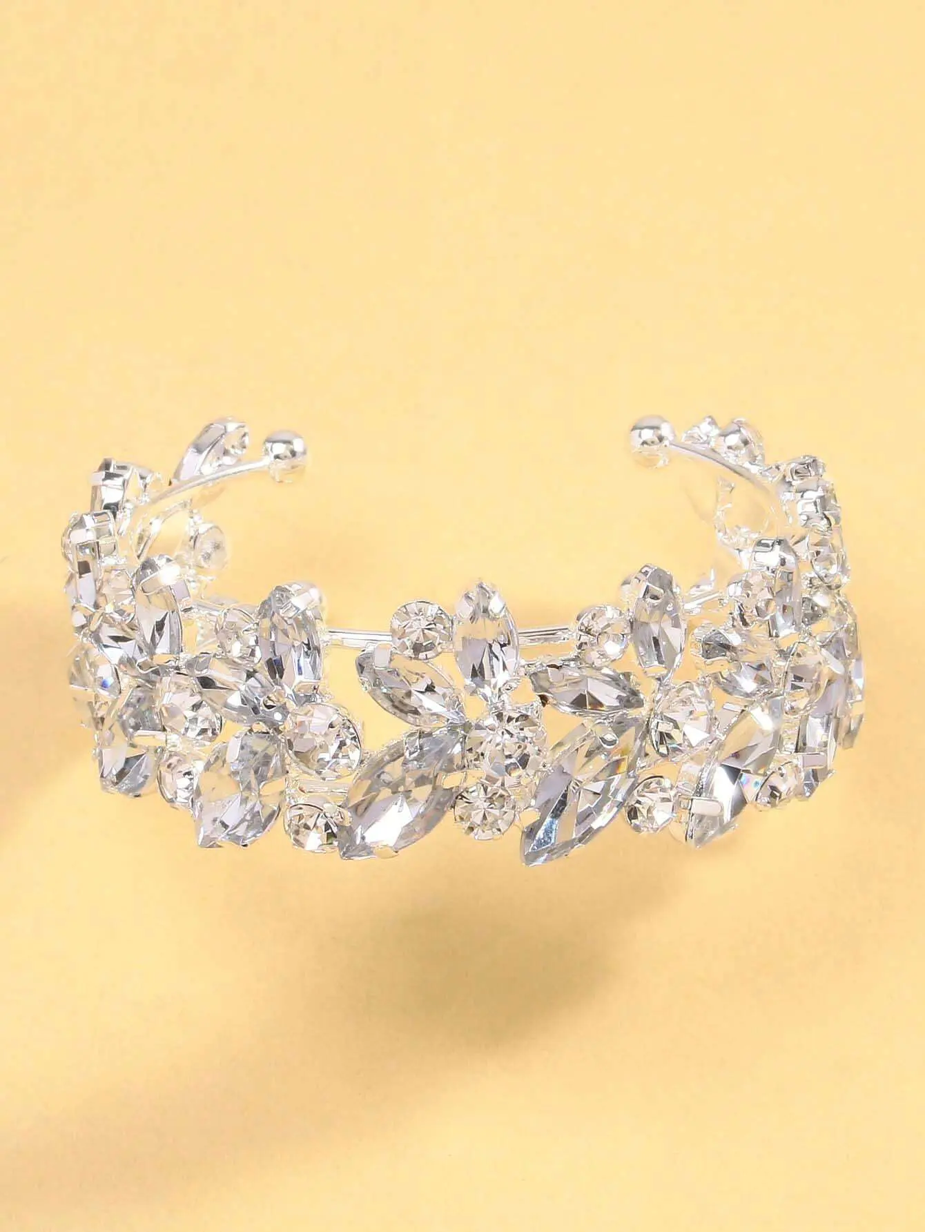 إسوارة فضية نسائية أنيقة مرصعة بالكريستال بتصميم مفتوح، لمظهر أنثوي مبهر، تضيف لمسة فاخرة وفريدة لأي إطلالة مسائية