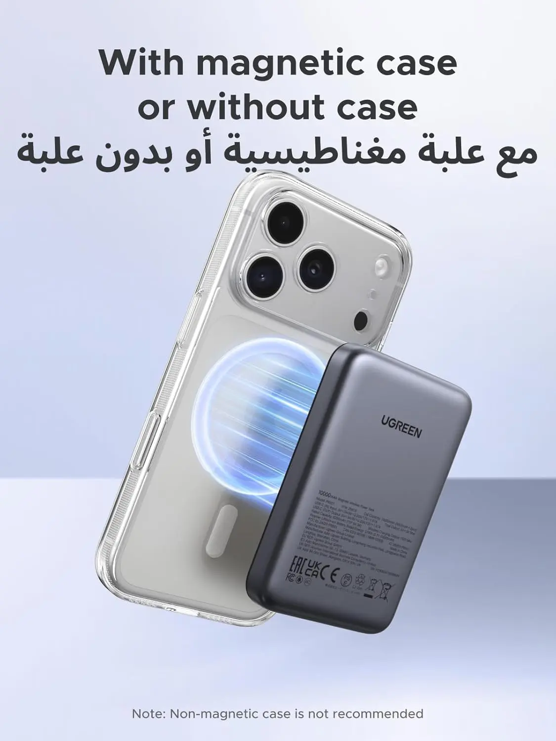 باور بانك UGREEN MagSafe سعة 10000mAh، شحن لاسلكي + شحن سلكي سريع PD 20W، مناسب لـ iPhone 12–17 (MagSafe) وكمان Samsung S25U، لون أسود.