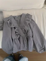 تميّزي بإطلالة راقية تجمع بين الأناقة الفرنسية والنعومة الكورية مع هذه البلوزة النسائية الرائعة. تأتي بتصميم كلاسيكي عصري يتمثل في نقشة المربعات الأنيقة بالألوان الرمادية والبيضاء، وتفاصيل أنثوية راقية تبرز الذوق الرفيع.