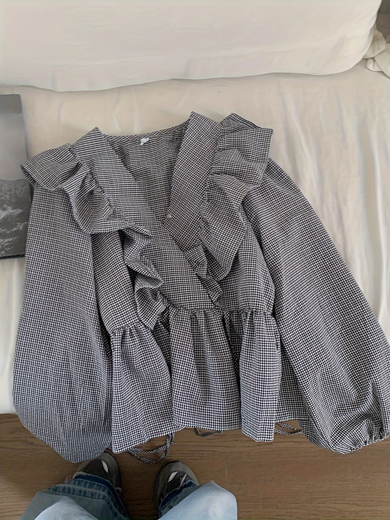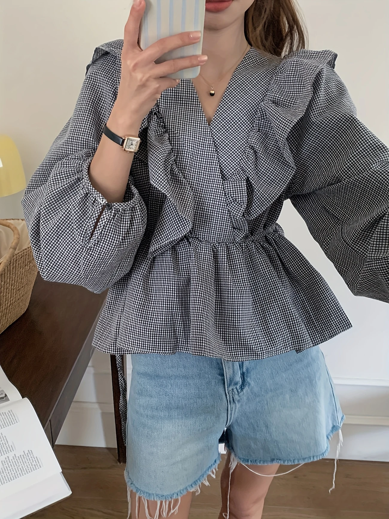 لوزة نسائية أنيقة بتصميم فرنسي مستوحى من الأسلوب الكوري – أكمام طويلة، رقبة V، مربعات رمادية وبيضاء