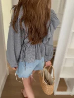 بلوزة نسائية بتصميم فرنسي بأكمام طويلة ورقبة على شكل V مع رباط قابل للتعديل وكتفين منتفخ – قميص كوري رمادي وأبيض مربعات لفصلي الربيع/الخريف، قطعة أنيقة غير شفافة بدون مطاطية