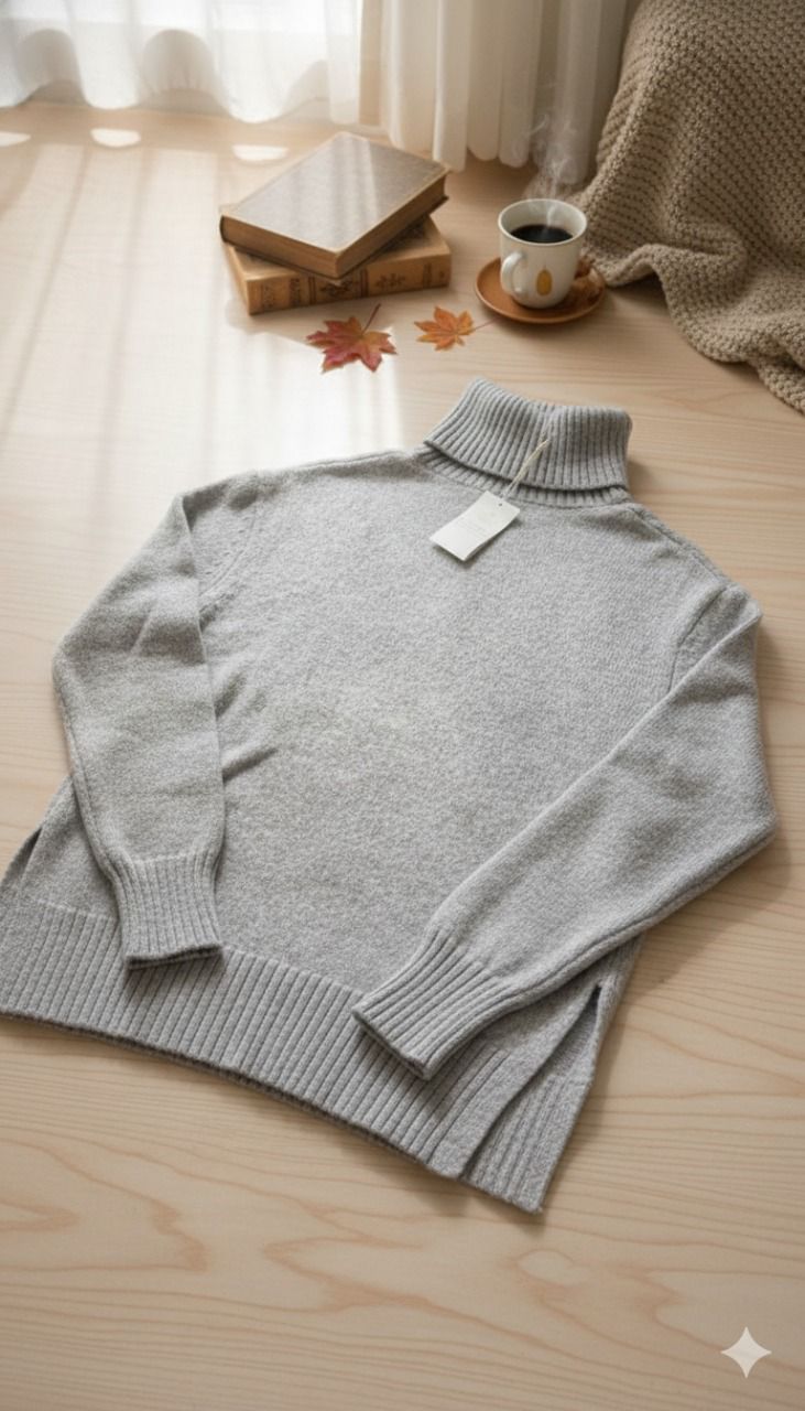 يتميز بلونه الرمادي الفاتح الذي يعكس النعومة والهدوء، مع تصميم برقبة عالية تضيف لمسة كلاسيكية فاخرة.