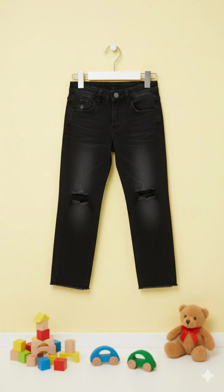 يُقدم بنطلون الجينز الأسود للأطفال مزيجًا مثاليًا من الراحة والأناقة، حيث يتميز بتصميم عصري ممزق عند الركبتين يمنحه طابعًا شبابيًا جذابًا.