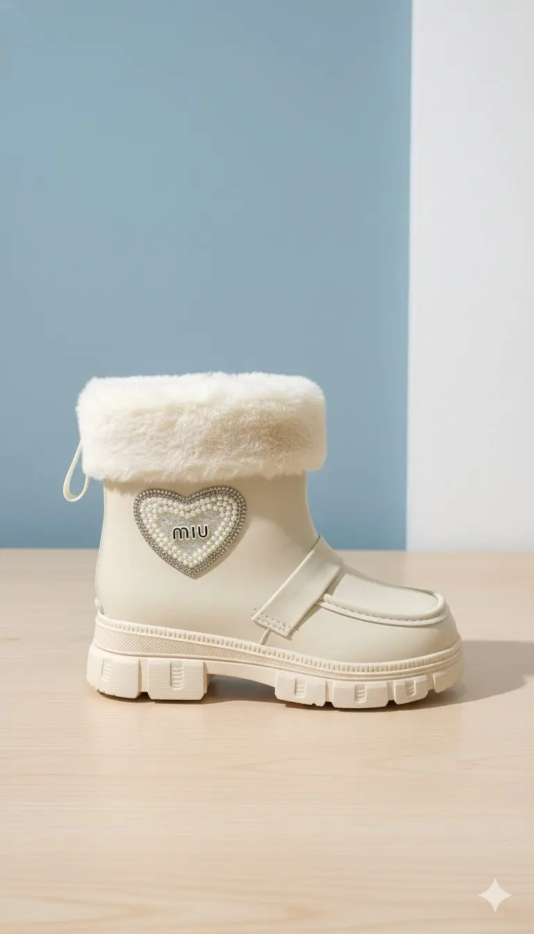يُقدَّم هذا البوت الشتوي للبنات بتصميم دافئ وعصري يجمع بين الأناقة والعملية، حيث يأتي مبطناً بالفرو ليمنح القدمين راحة ودفئاً خلال الأيام الباردة. يتميز باللون أوف وايت الهادئ مع قلب لامع وشعار MIU لإضفاء لمسة جمالية راقية، كما يأتي بنعل مرتفع مضاد للانزلاق يوفر ثباتاً أثناء المشي، ليكون خياراً مثالياً للإطلالات اليومية والأزياء الشتوية.