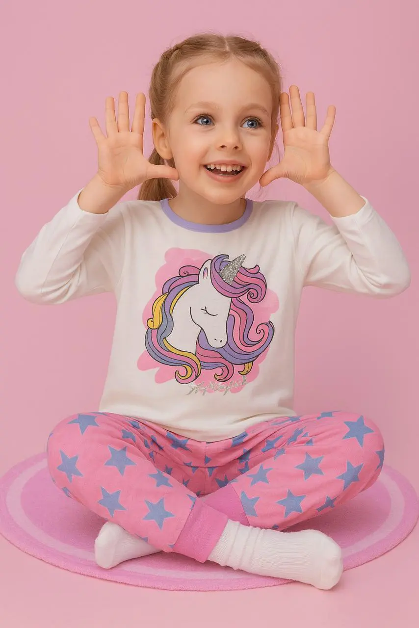 تجمع هذه البيجاما البناتي بين الراحة والمرح بتصميمها اللطيف والمفعم بالألوان، حيث تأتي بطبعة يونيكورن مبهجة تضيف لمسة خيالية إلى إطلالة النوم.
