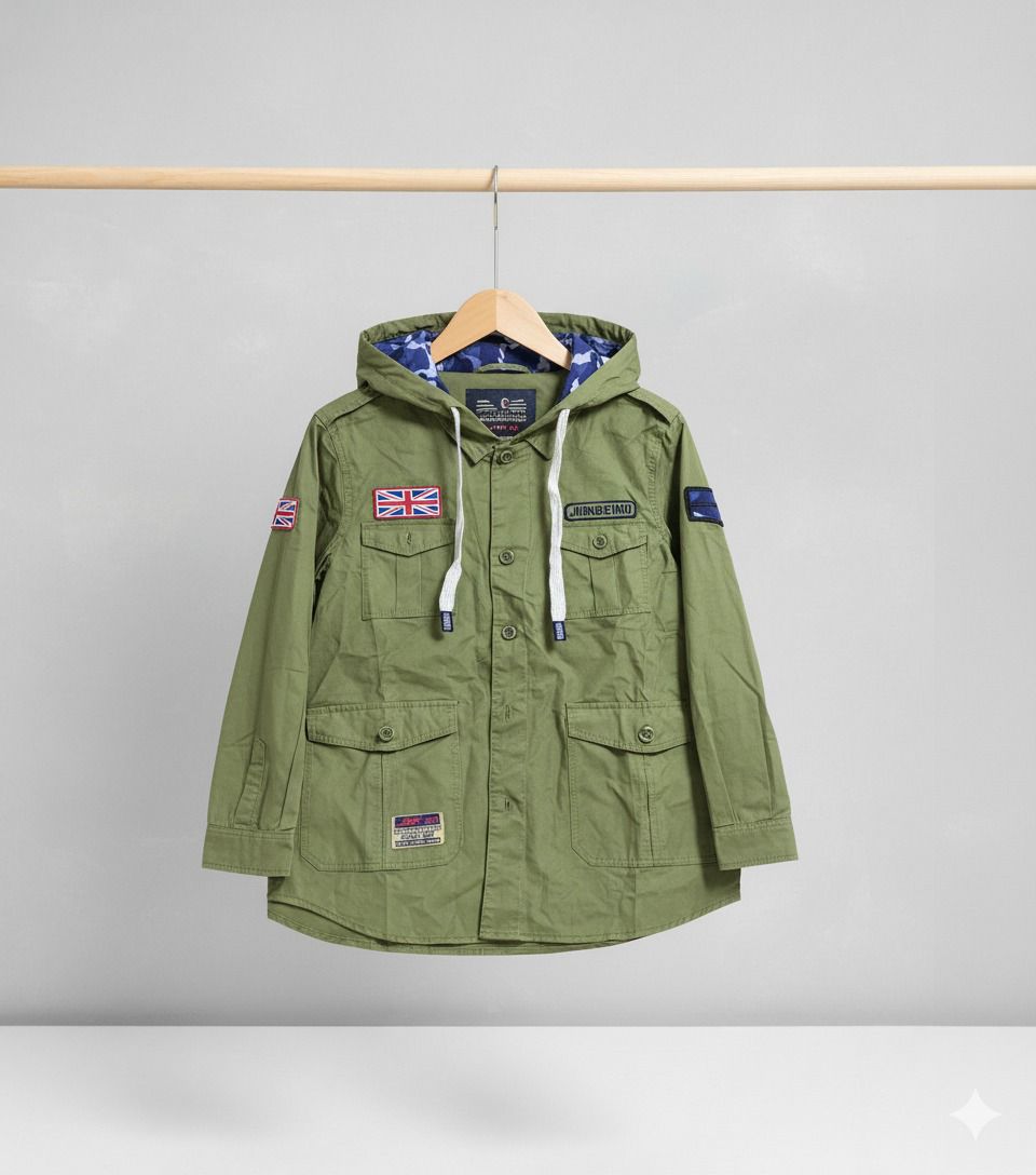 أضف لمسة من الأناقة الجريئة لإطلالة طفلك مع الجاكيت الكاجوال باللون الزيتي والتصميم العسكري العصري.
