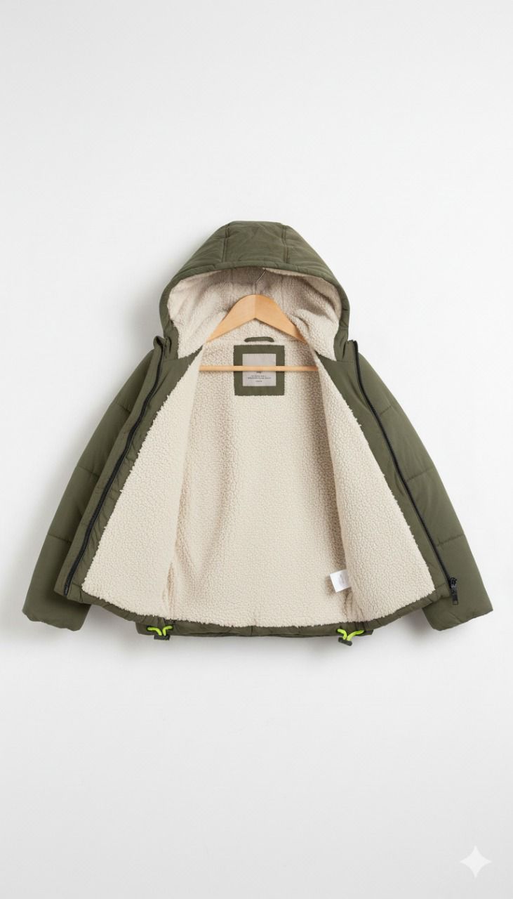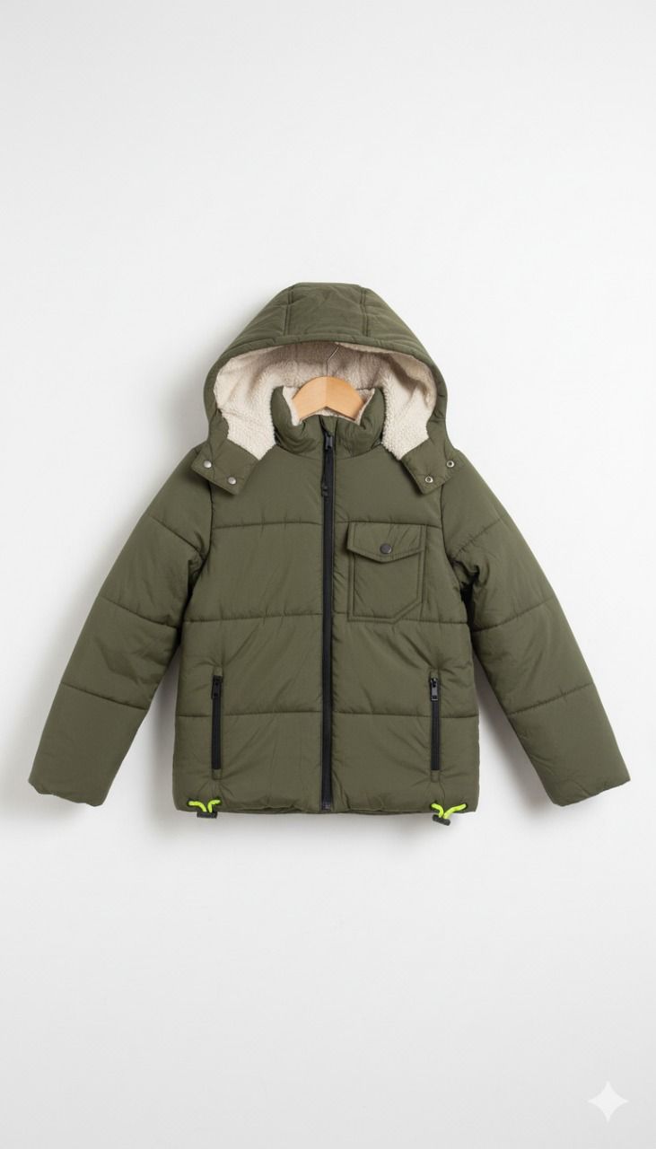 يتميّز هذا الجاكيت الشتوي للأطفال بتصميم يجمع بين الوظيفة والأناقة، إذ يأتي بلون زيتي عصري يناسب مختلف الإطلالات الشتوية.
