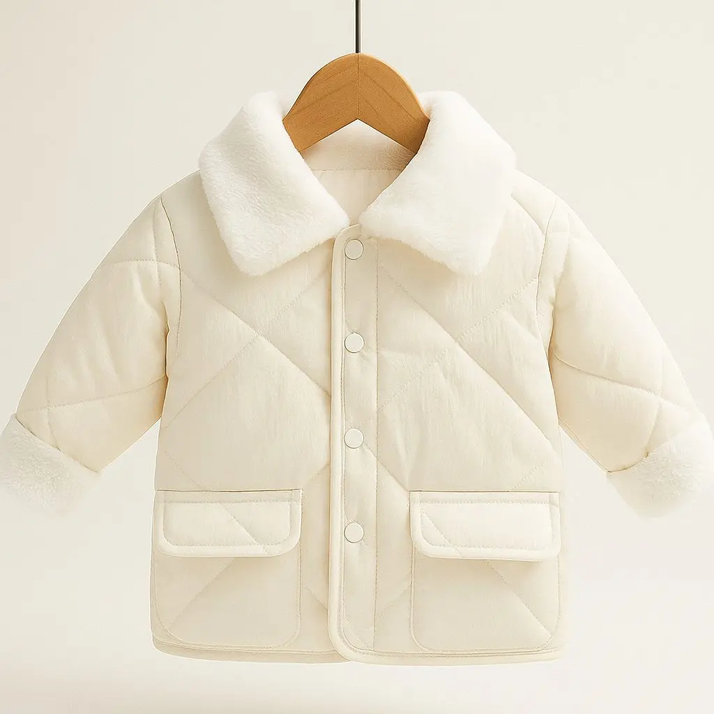 جاكيت أطفال مبطن فرو شتوي، أبيض كلاسيكي بياقة ناعمة وجيوب أمامية