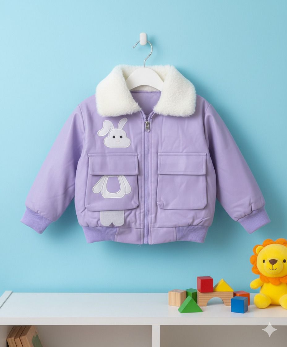 جاكيت أطفال موف مبطن فرو بتصميم أرنب، دافئ وناعم للشتاء، بطانة فرو داخلية توفر دفئًا مثاليًا في الأجواء الباردة