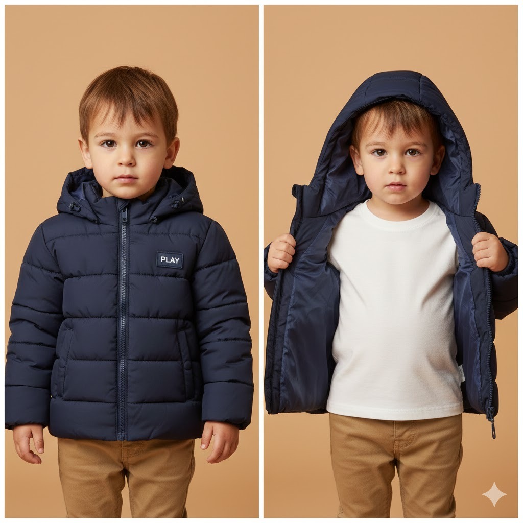 يظهر بجانب صورة المنتج جاكيت بافر بتصميم عصري وأنيق، يمنح طفلك الدفء المثالي والمظهر الجذاب في الشتاء. مصنوع من خامات عالية الجودة مقاومة للرياح، ببطانة ناعمة لراحة تدوم طوال اليوم.