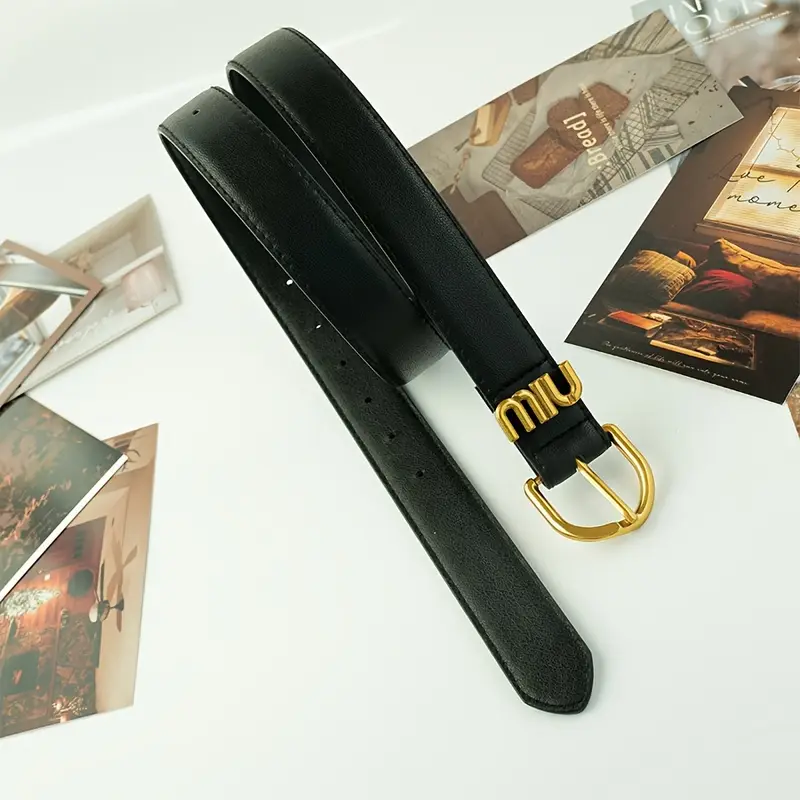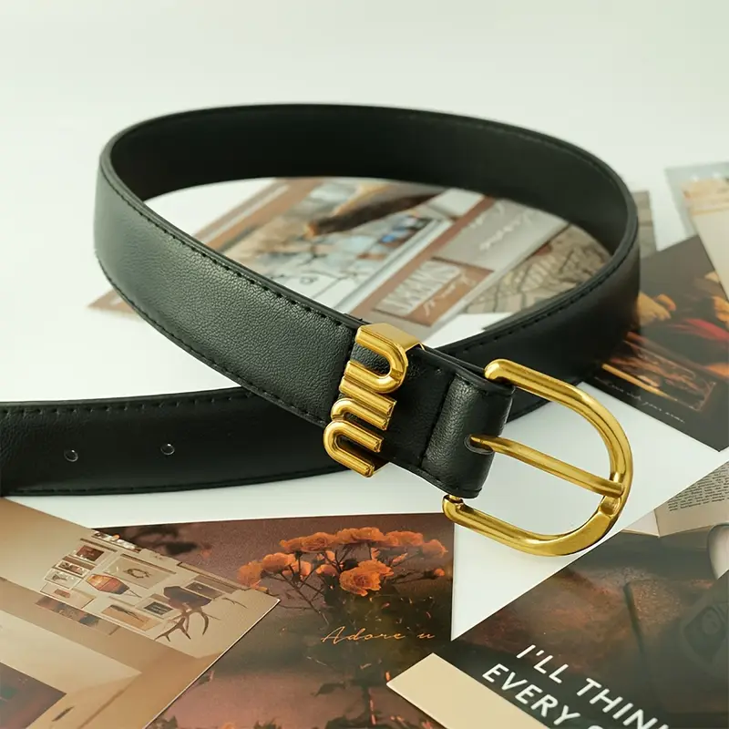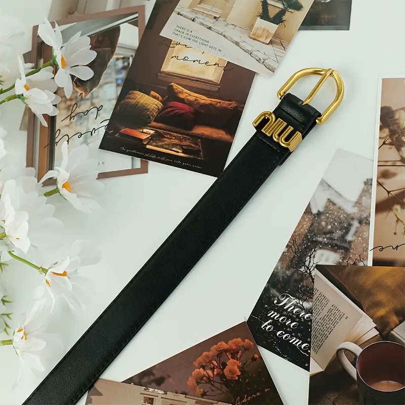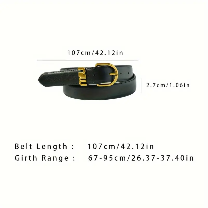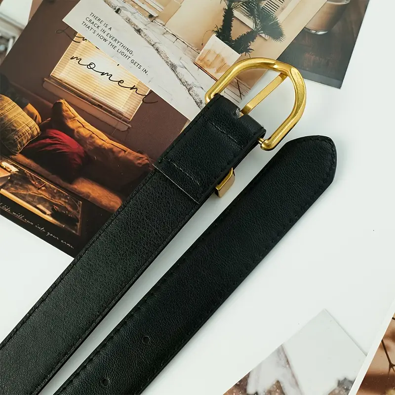 حزام جلد صناعي نسائي أسود بمشبك ذهبي، تصميم أنيق قابل للتعديل للملابس اليومية والرسمية