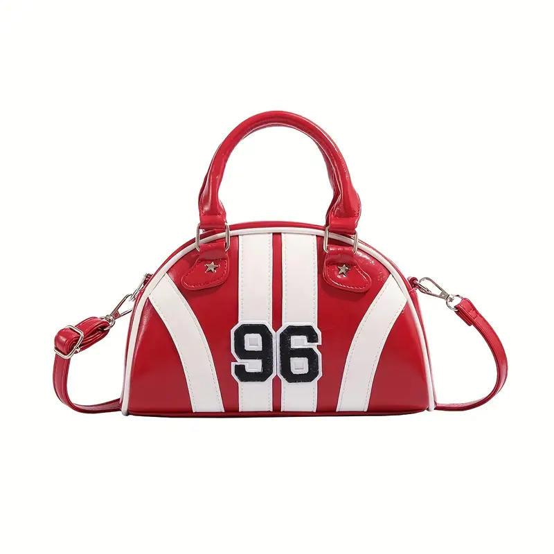 حقيبة بولينج نسائية رياضية بألوان متباينة مع حزام قابل للفصل – تصميم مخطط باللون الأحمر والبيض الزاهي، مادة PU، مثالية للكلية، الخروجات العادية والاستخدام اليومي، إكسسوارات البولينج