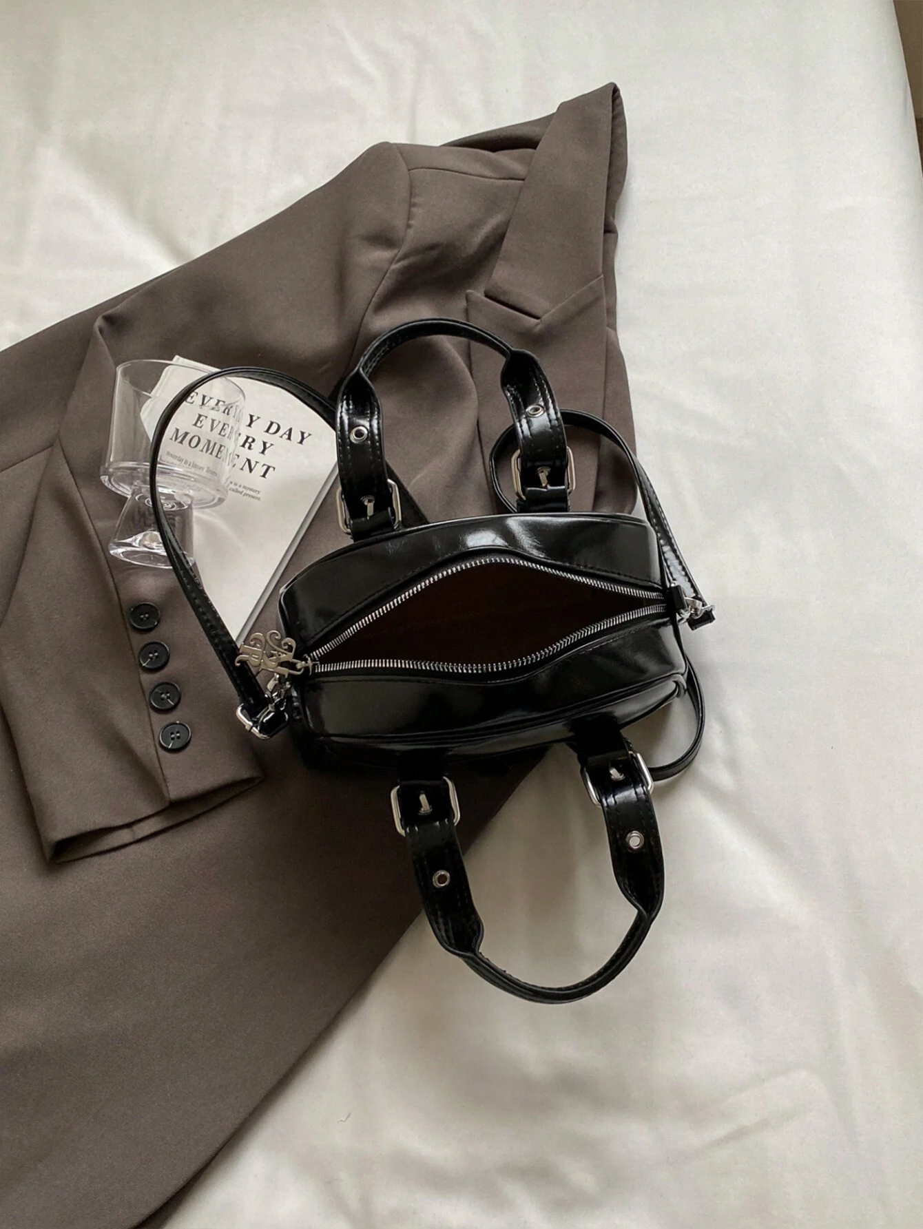 امنحي إطلالتك لمسة جريئة ولافتة مع هذه الحقيبة المصممة بروح البانك المدرسي. اللون النبيذي الغني، وخامة الباتشوورك الأنيقة، والحلقات المعدنية تضيف تفاصيل فريدة من نوعها. سهلة الحمل بفضل المقابض المزدوجة القابلة للتعديل، وحزام الكتف الطويل الذي يناسب تنقلك اليومي بسهولة وأناقة.
