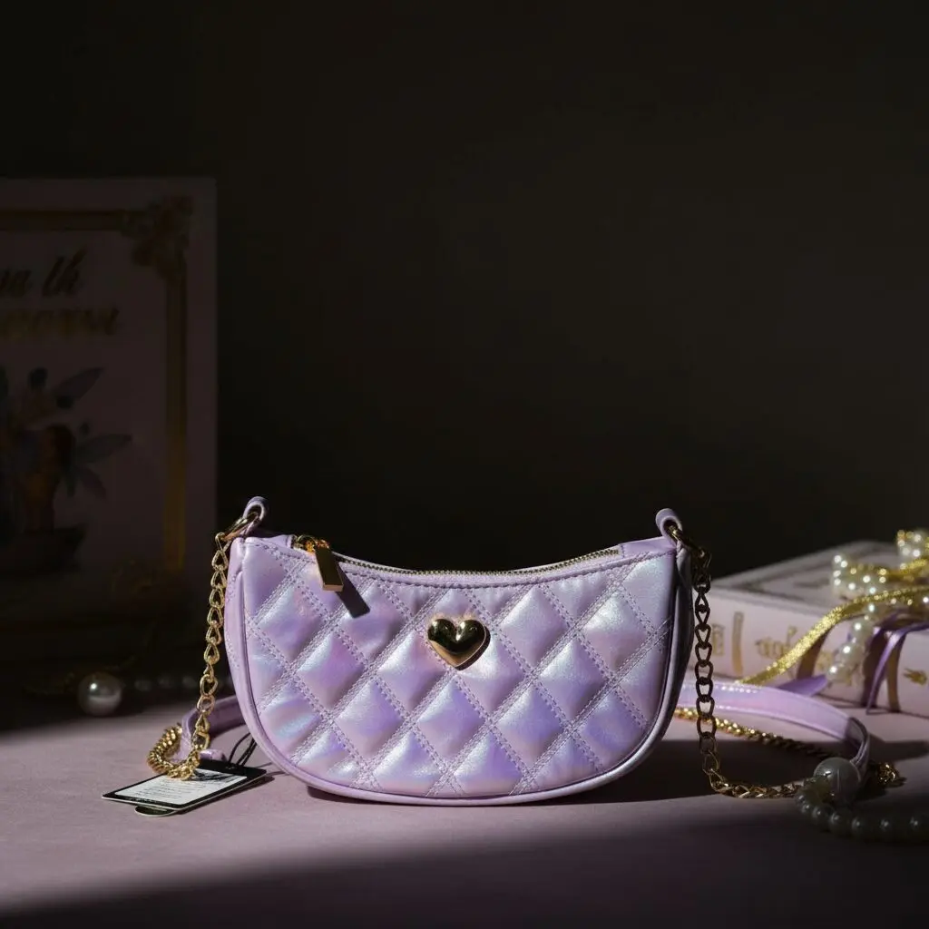 حقيبة يد مبطنة للأطفال بلون ليلكي مع سلسلة وحلية قلب ذهبية