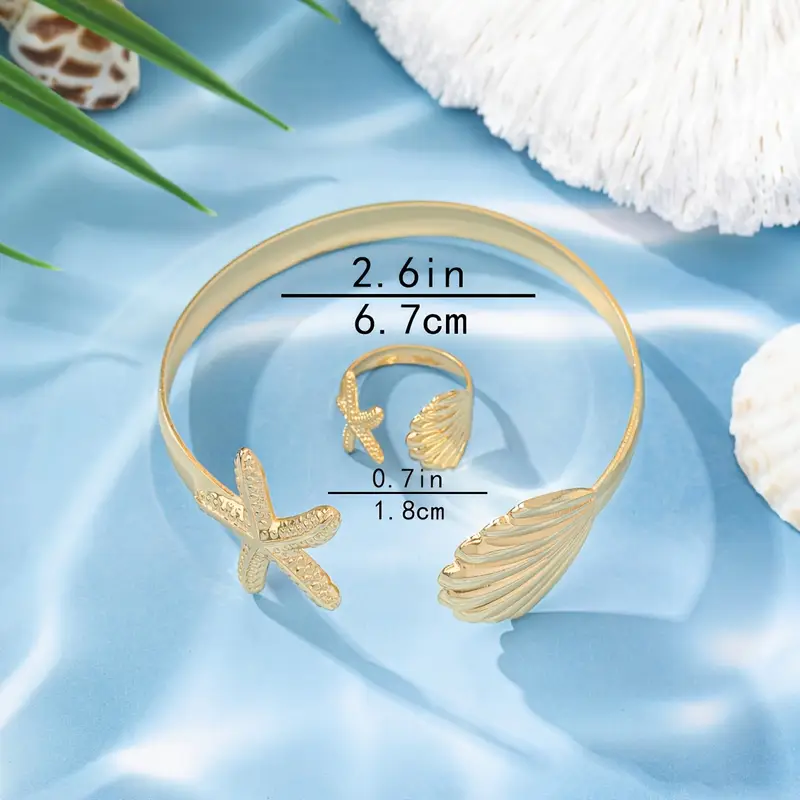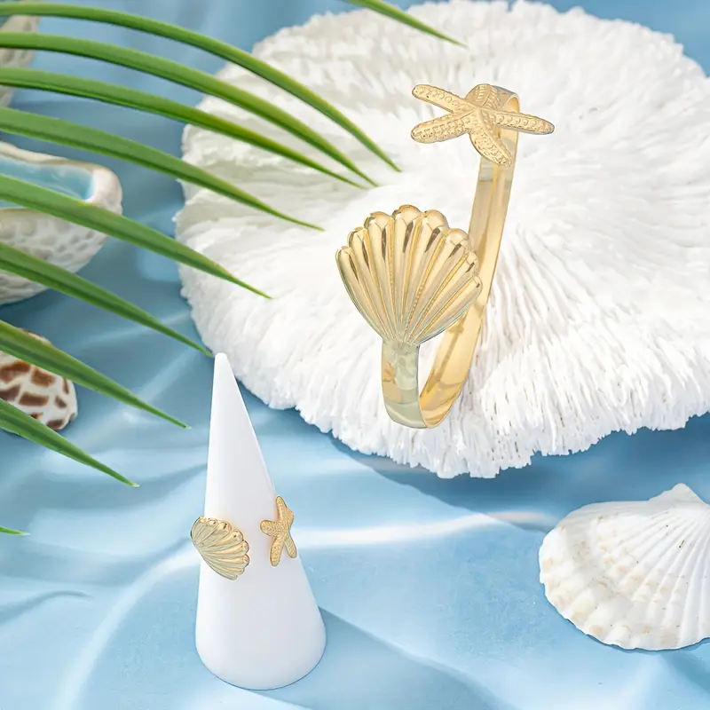 خواتم قدم نسائية نجمة البحر والصدف، طقم من قطعتين بإطلالة صيفية قابلة للتعديل