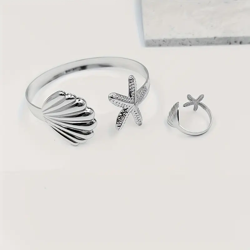 تميزي بأسلوبك مع طقم من خواتم القدم المستوحاة من البحر، حيث يجمع بين رمزي النجمة والصدفة في تصميم أنيق بنمط عتيق.