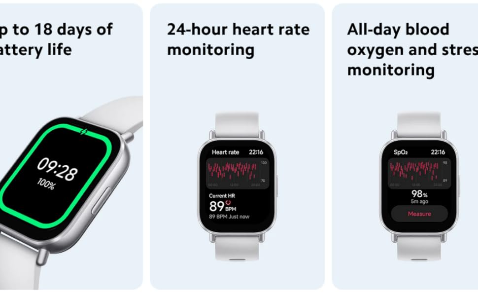عمر بطارية طويل يصل إلى 18 يومًا مع عمر بطارية يصل إلى 18 يومًا في الوضع العادي وبطارية 470 mAh، توفر ساعة ريدمي 5 اكتيف استخدامًا طويل الأمد دون شحن متكرر.
