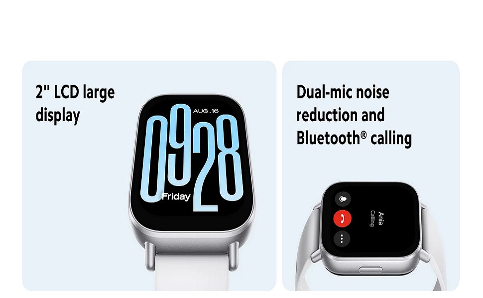 شاشة LCD كبيرة 2.0 بوصة: تتميز ساعة ريدمي ووتش 5 اكتيف بشاشة مقاس 2.0 بوصة بدقة 320 × 385 بكسل و250 بكسل لكل بوصة، مما يوفر شاشة واضحة ومشرقة، مثالية للاستخدام اليومي.