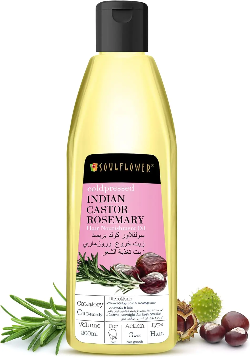 - زيت إكليل الجبل والخروع للشعر غني بالعناصر الغذائية ويدعم فروة رأس صحية وشعر طويل وسميك ولامع. يعد زيت الخروع وإكليل الجبل المعصور على البارد من سول فلاور مرطبًا طبيعيًا للشعر وفروة الرأس ويحفز نمو الشعر.