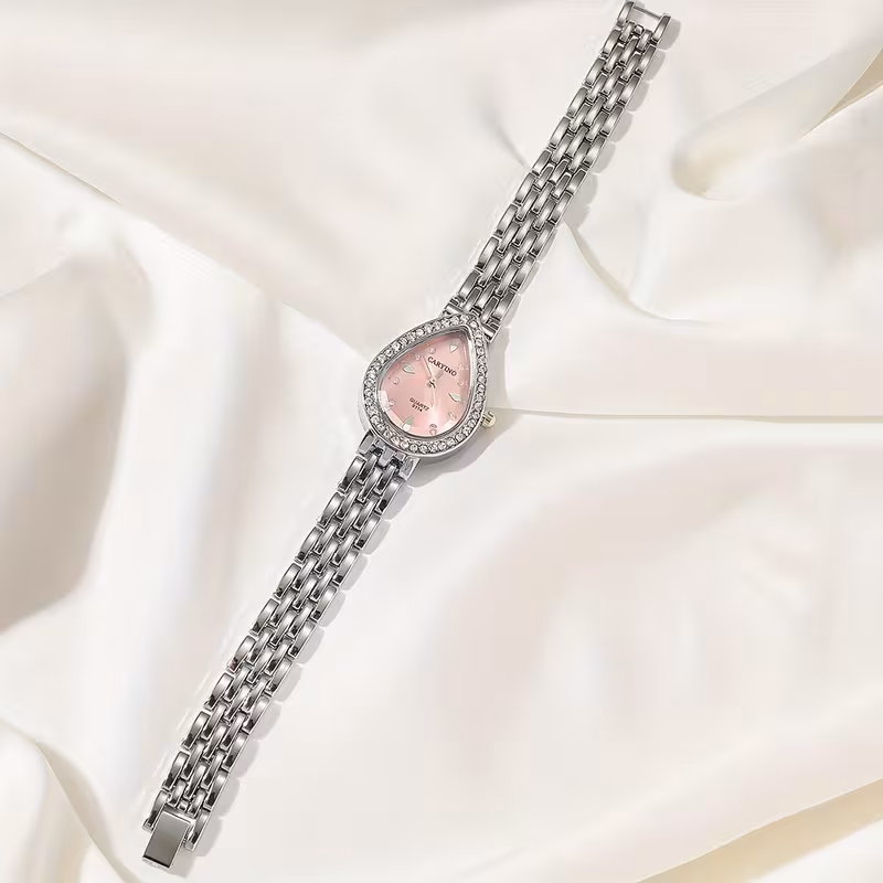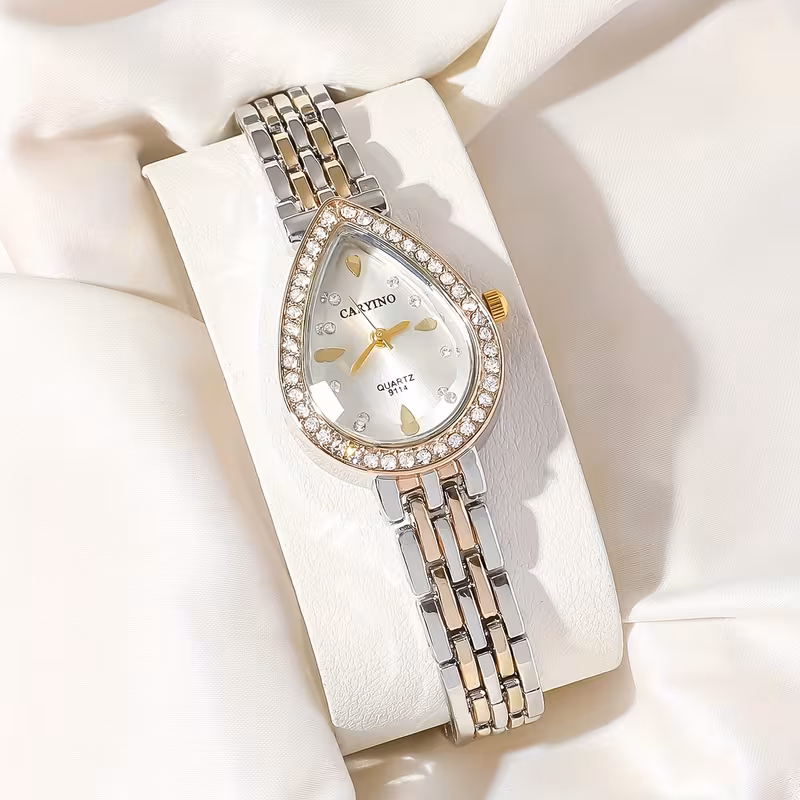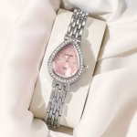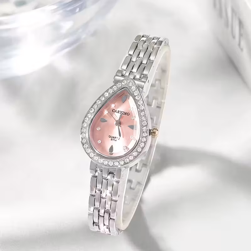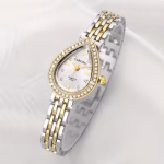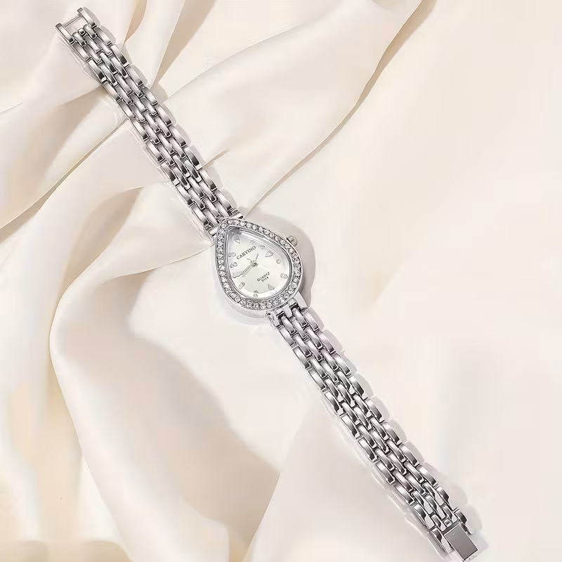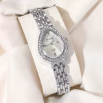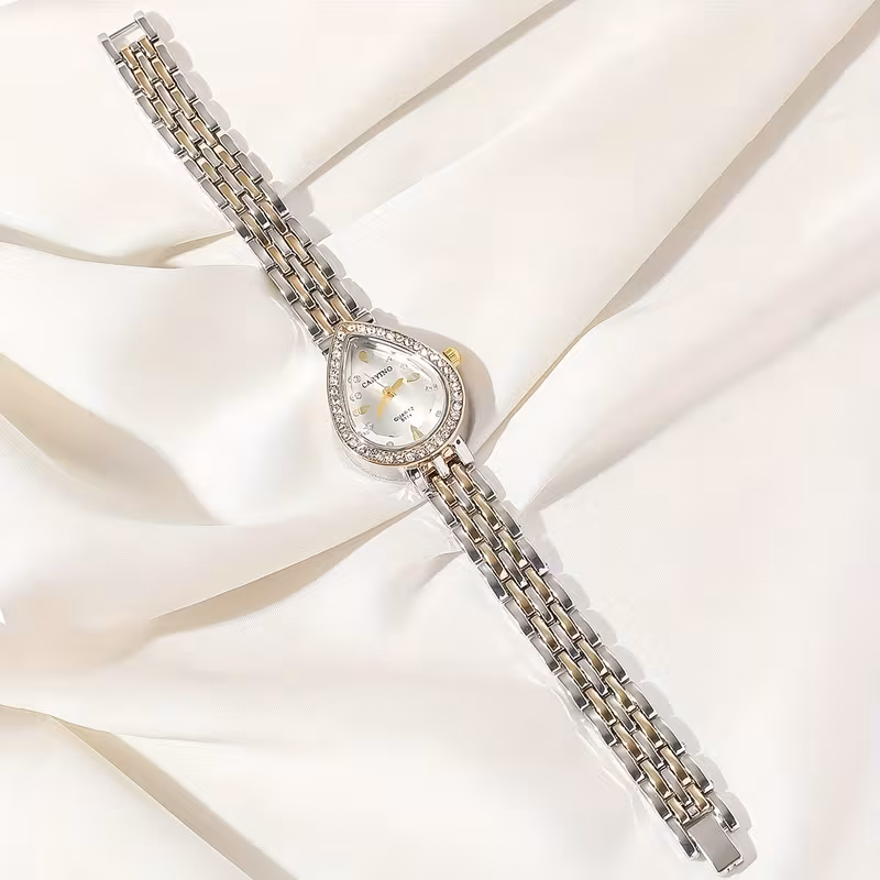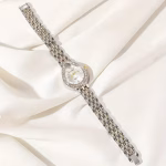 تُقدَّم هذه الساعة النسائية الكوارتز بتصميم أنيق يجمع بين الكلاسيكية والفخامة العصرية، حيث تأتي بعلبة بيضاوية مزينة بحجر الراين اللامع تضفي لمسة راقية على الإطلالة. تم تصميمها بسوار معدني كلاسيكي يمنح مظهراً أنثوياً متناسقاً، مما يجعلها خياراً مثالياً للارتداء اليومي وكذلك لهدايا العطلات والمناسبات الخاصة.