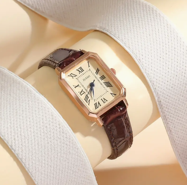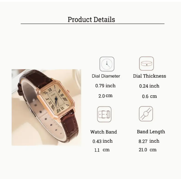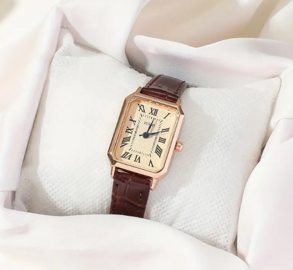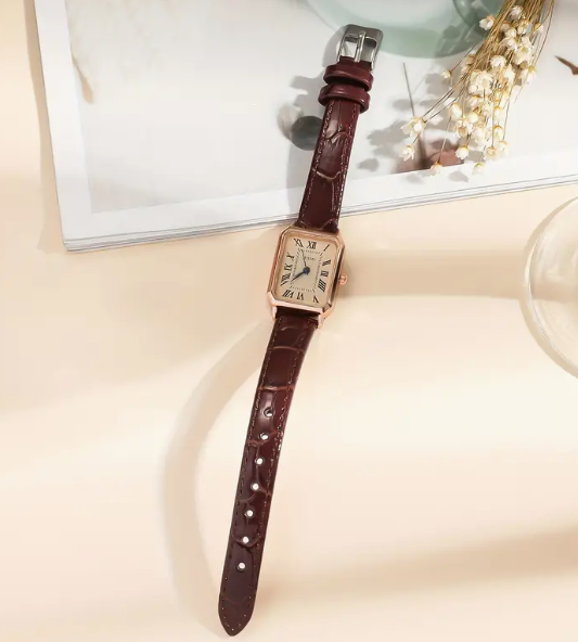 ساعة يد نسائية أنيقة من الجلد الصناعي بتصميم مستطيل كاجوال مع مؤشر كوارتز وأرقام رومانية