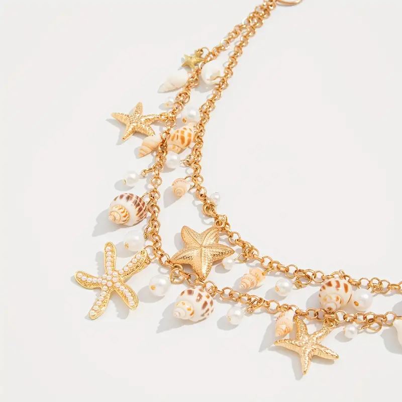 أكملي إطلالتك الصيفية بلمسة بحرية راقية مع هذه السلسلة البوهيمية المصممة بعناية من خامات معدنية خفيفة ومزينة بتفاصيل مستوحاة من أعماق المحيط: صدفة، شبح البحر، ولؤلؤ صناعي أنيق.