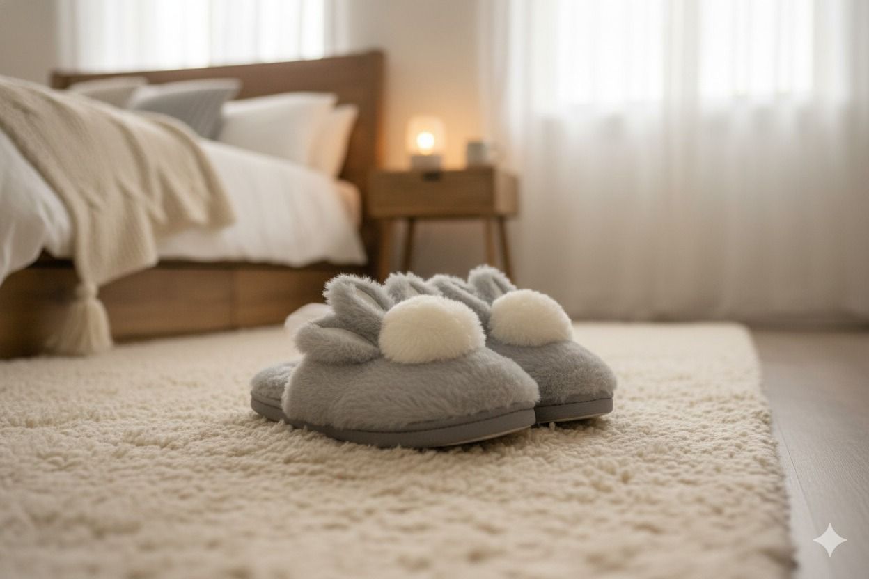 خامته الفرو الناعمة توفر إحساسًا بالدفء طوال اليوم، بينما يضمن النعل المطاطي الثبات على الأرضيات.