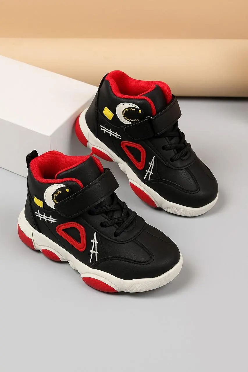 يأتي هذا السنيكرز الأنيق بلون أسود مع لمسات حمراء نابضة بالحياة وتطريز جرافيكي بتصميم عين مميز يضيف لمسة من الجرأة والتفرد إلى إطلالة طفلك.