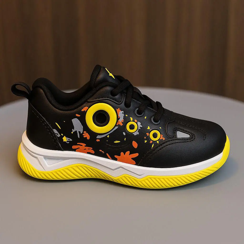 سنيكرز أطفال أسود بطبعة سبلاش وأطراف صفراء، حذاء رياضي عصري ومريح