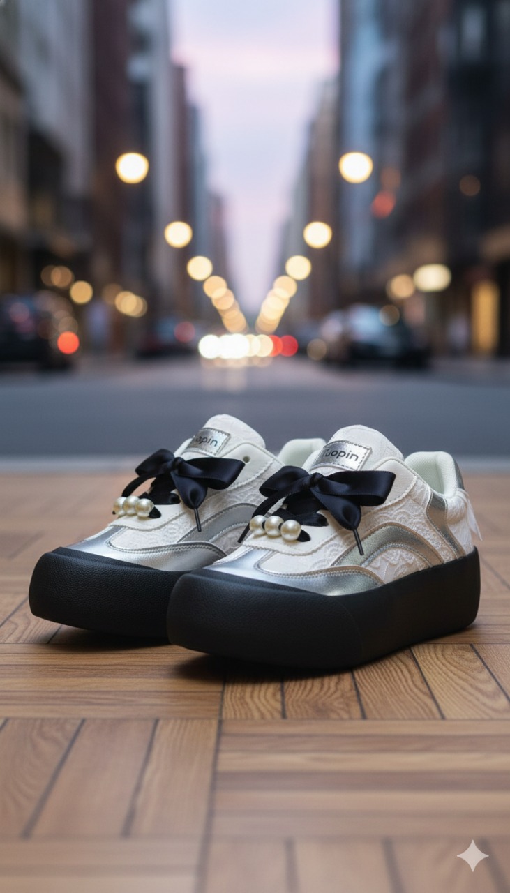 يُقدَّم هذا السنيكرز النسائي بتصميم يجمع بين الفخامة والراحة، ليمنح إطلالتك لمسة عصرية أنيقة تناسب مختلف المناسبات اليومية. يجمع بين اللون الفضي اللامع والتفاصيل اللؤلؤية الراقية ورباط الساتان الأسود لإضفاء طابع أنثوي جذّاب يعكس الذوق العصري الراقي.