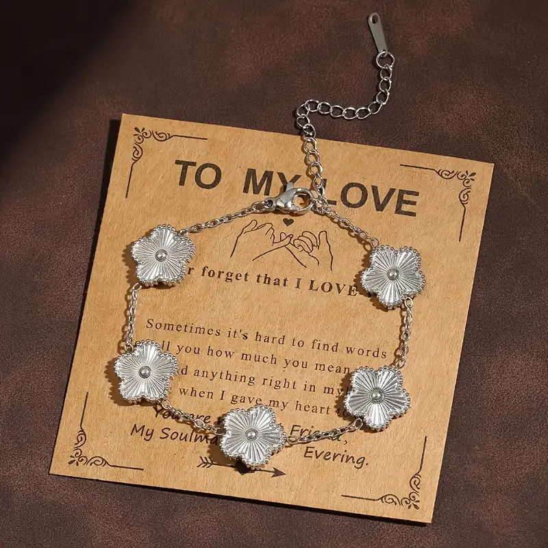 اجمعي بين الأناقة والرمزية مع هذا السوار الذهبي الراقي المصمم على شكل زهرة بنمط عتيق. مصنوع من الفولاذ المقاوم للصدأ لضمان المتانة وطول العمر، ويأتي مع بطاقة رسالة حب تحمل كلمات ملهمة، ليكون أكثر من مجرد إكسسوار؛ إنه تعبير راقٍ عن المشاعر. مثالي كهدية مميزة في رمضان، أو لإضفاء لمسة من الأناقة الهادئة على إطلالتك اليومية.