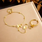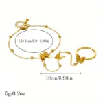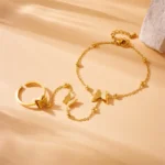 أضيفي لمسة من السحر والرقي إلى إطلالتك مع سوار الفراشة الذهبي المصمم بدقة وأناقة. بفضل تصميمه الحلقى المفتوح المصنوع من الفولاذ المقاوم للصدأ وسلسلته الرقيقة، يُعد هذا الإكسسوار خيارًا مثاليًا للارتداء اليومي، المناسبات، أو كهديّة أنثوية راقية تعكس الذوق الكلاسيكي المعاصر.