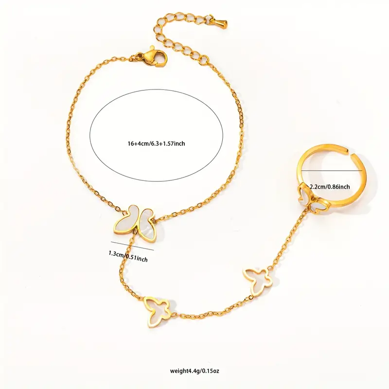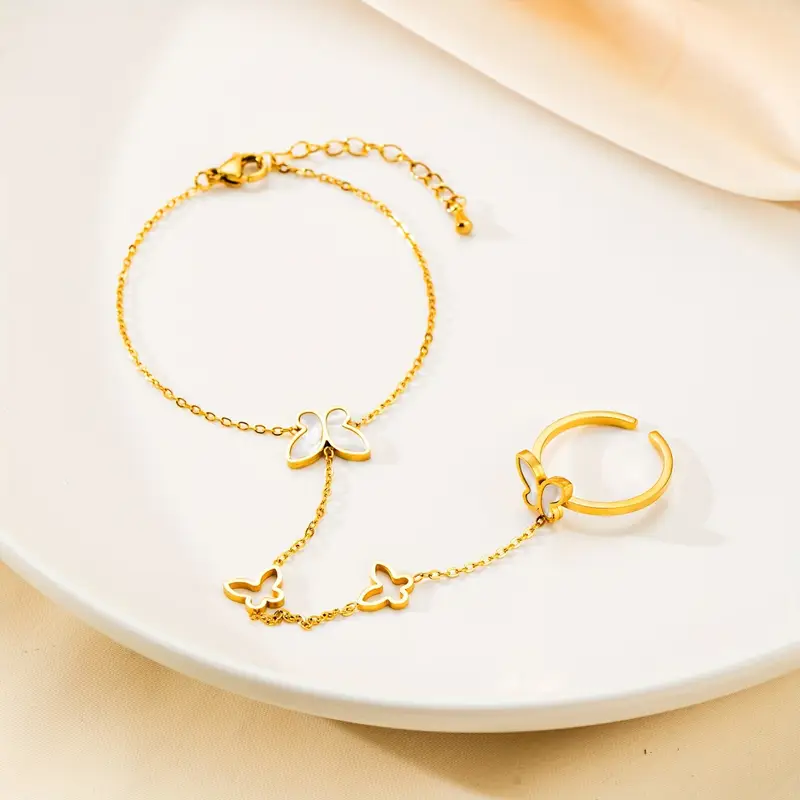 أضيفي لمسة من السحر والرقي إلى إطلالتك مع سوار الفراشة الذهبي المصمم بدقة وأناقة. بفضل تصميمه الحلقى المفتوح المصنوع من الفولاذ المقاوم للصدأ وسلسلته الرقيقة، يُعد هذا الإكسسوار خيارًا مثاليًا للارتداء اليومي، المناسبات، أو كهديّة أنثوية راقية تعكس الذوق الكلاسيكي المعاصر.