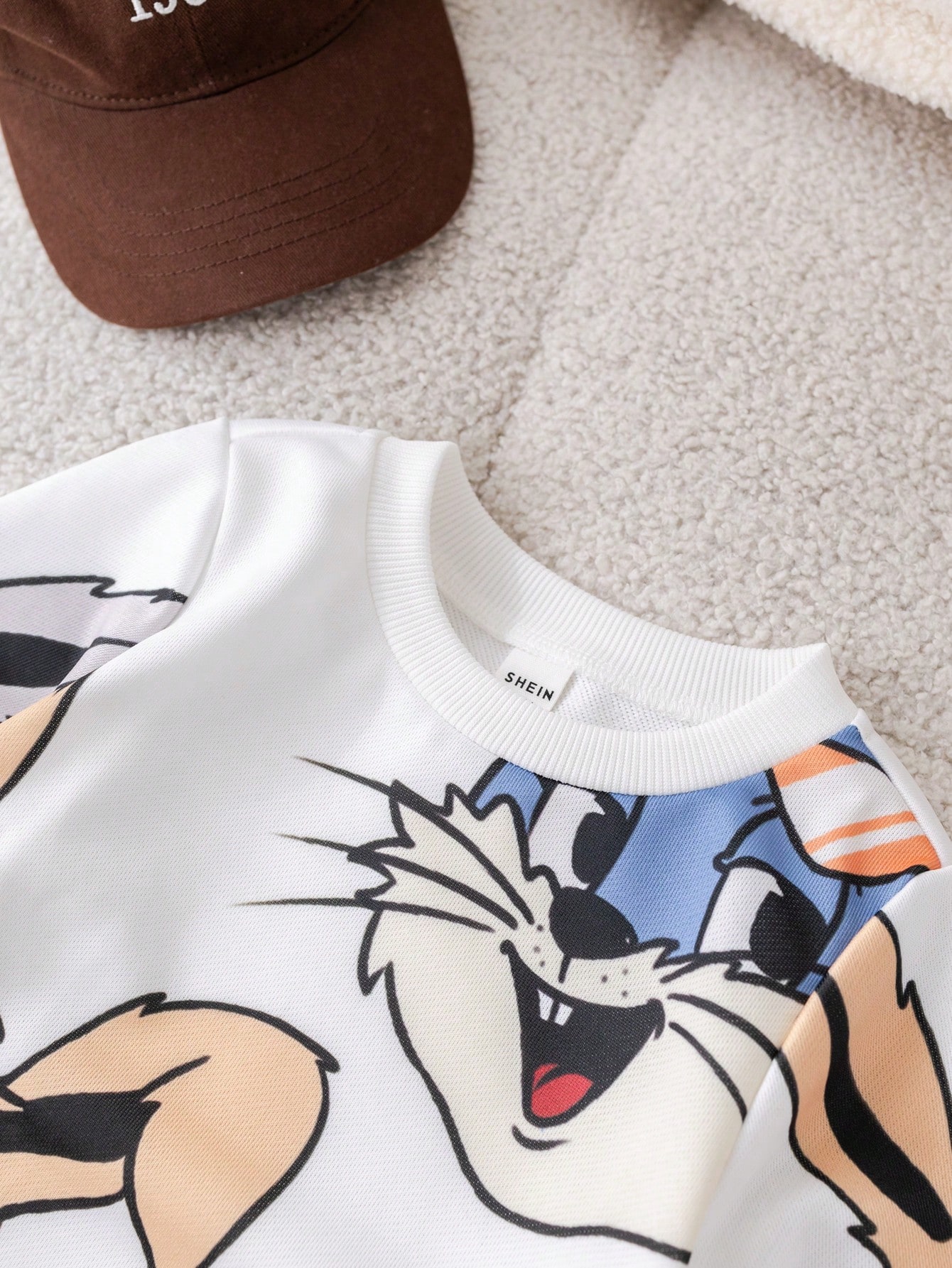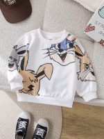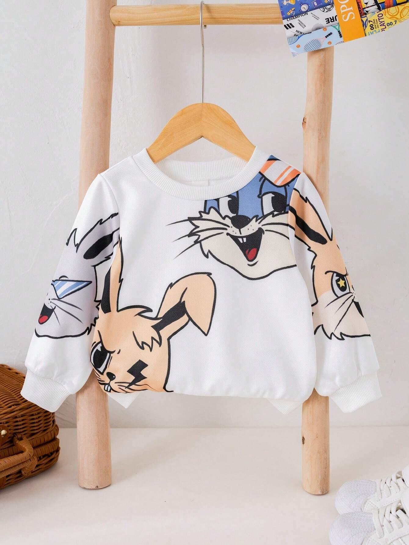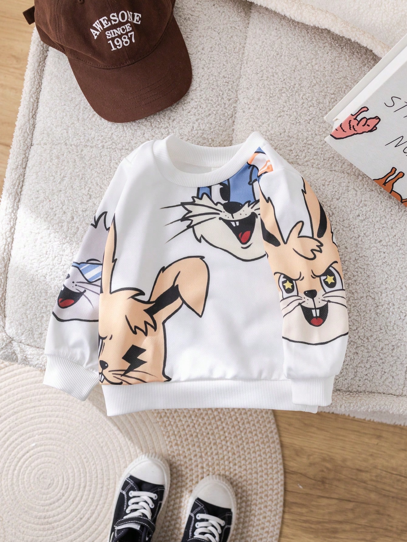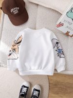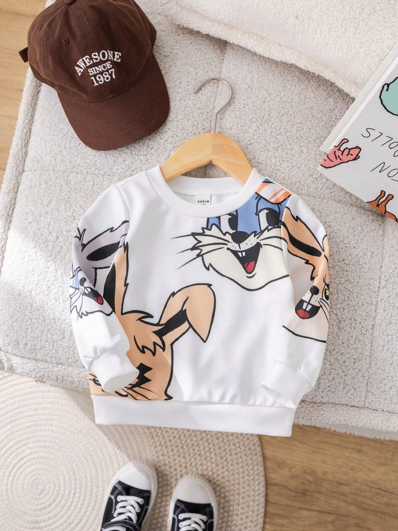 سويتشيرت أطفال أبيض مطبوع بشخصيات كرتونية، تصميم عصري مفعم بالحيوية