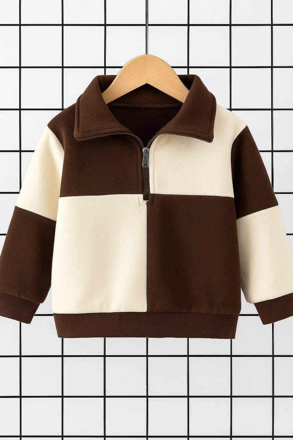 يُقدَّم هذا السويتشيرت الأنيق للأطفال بتصميم عصري يجمع بين الأناقة والدفء، بفضل خامته القطنية المريحة وسحّابه النصفي العملي، مع نقشة المربعات الثنائية بالألوان البني والكريمي التي تضيف لمسة راقية لإطلالة الخريف والشتاء.
