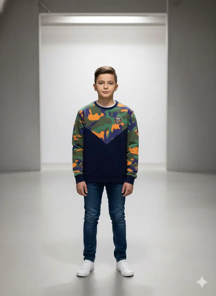 يُقدَّم هذا السويتشيرت بتصميم رياضي مستوحى من النقوش العسكرية العصرية، ليمنح الأطفال مظهرًا قويًا وحيويًا يعكس روح النشاط. يجمع بين الأناقة العملية والراحة اليومية بخامات عالية الجودة تضمن الدفء والمرونة في مختلف الأنشطة.