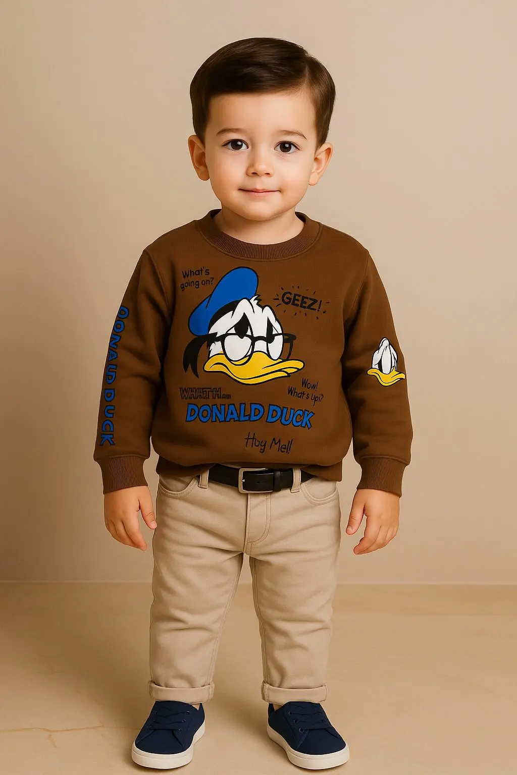 إطلالة مرحة ومريحة يقدمها هذا الطقم الكاجوال للأولاد، والمكون من سويتشيرت بني بطبعة Donald Duck المحبوبة عملي ومريح.