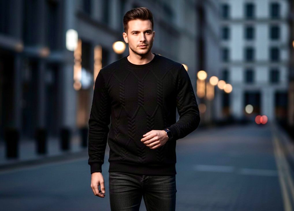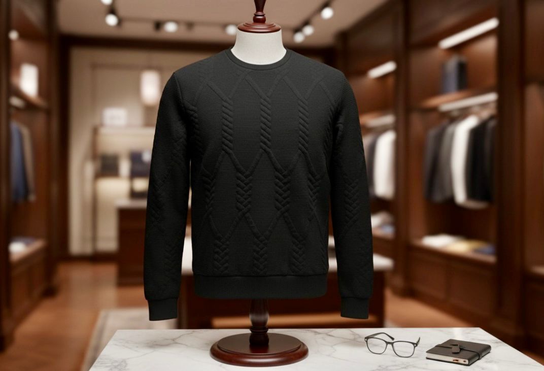 سويتشيرت رجالي أسود كلاسيكي بنقشة كابل، تصميم شتوي أنيق من القطن الناعم، تصميم كلاسيكي أنيق يناسب مختلف المناسبات