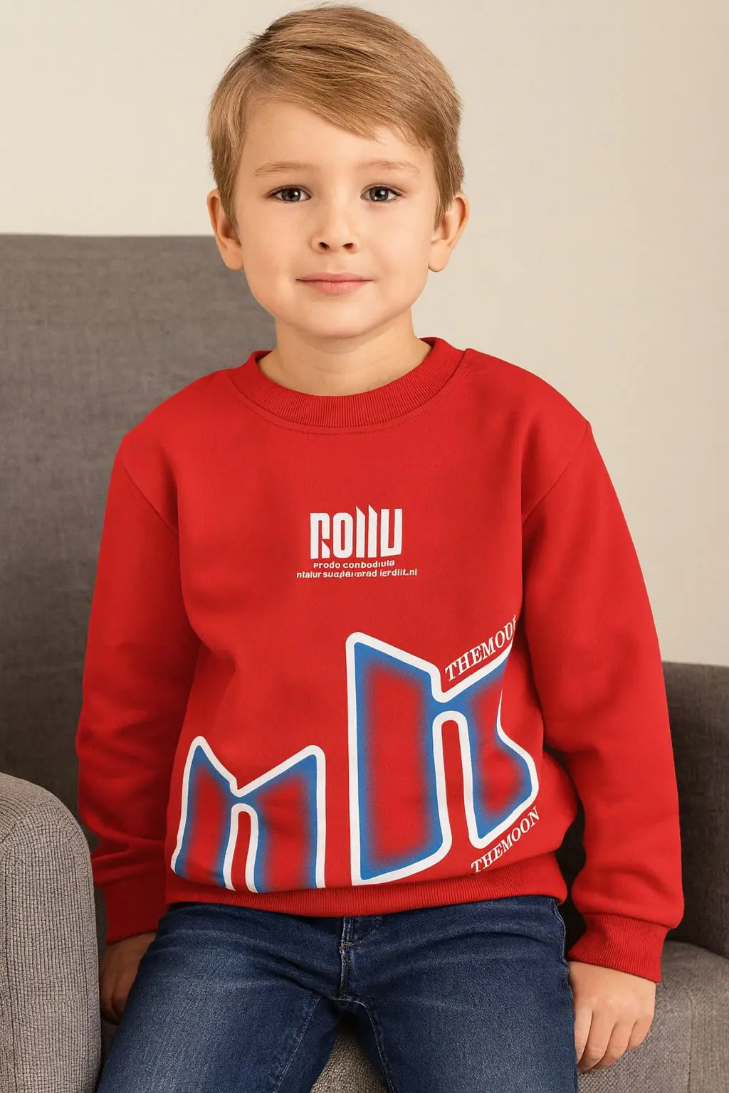 أضف لمسة من الحيوية لإطلالة طفلك مع هذا السويت شيرت الأحمر المطبوع بتصميم جرافيك عصري وكلمات باللون الأبيض.