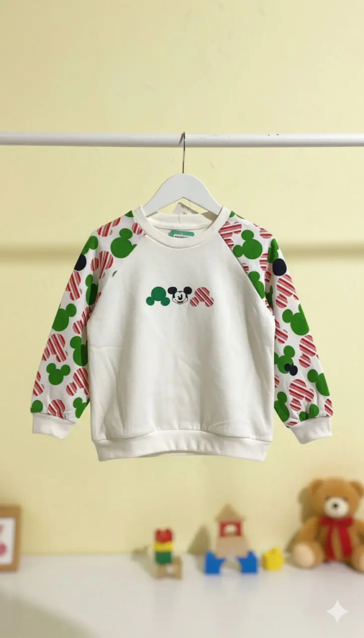 يُقدَّم سويت شيرت الأطفال المطبوع برسومات ميكي بتصميم أنيق يجمع بين الراحة والمرح، مصنوع من خامة قطنية ناعمة تمنح دفئًا ولمسة مريحة على البشرة. يتميز بتدرجات لونية جميلة تجمع بين الأبيض مع أكمام منقوشة بالأخضر والأحمر، ليمنح الأطفال إطلالة مرحة تناسب الأجواء الخريفية والشتوية.