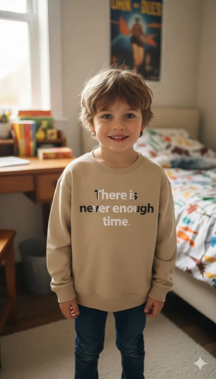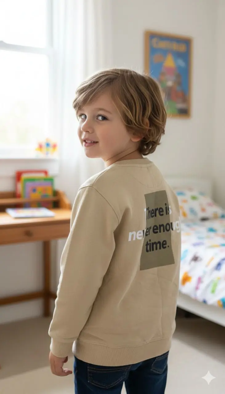 تمنح الطباعة الأمامية بعبارة (There is never enough time.) لمسة شبابية مميزة تعبّر عن الأسلوب العصري للأطفال، بينما يوفّر القماش القطني المريح إحساسًا ناعمًا ودفئًا مثاليًا للأيام الباردة أو الإطلالات الكاجوال اليومية.